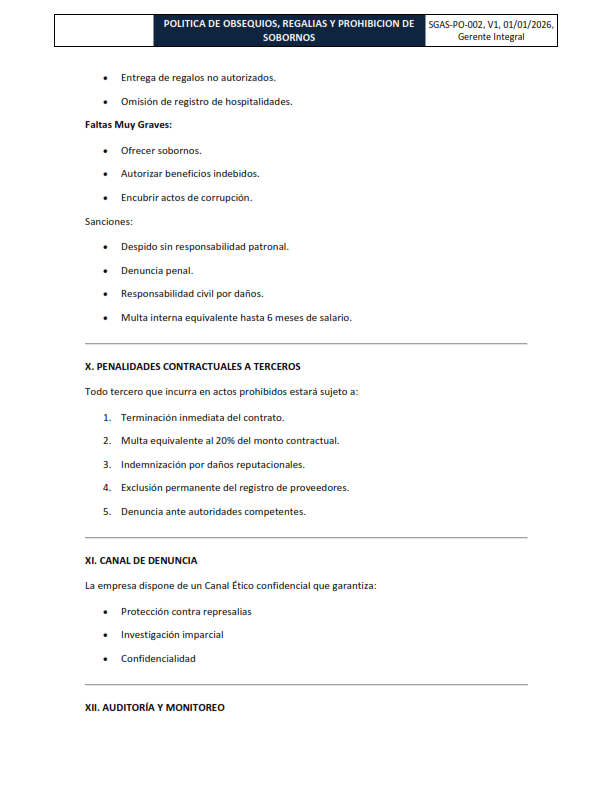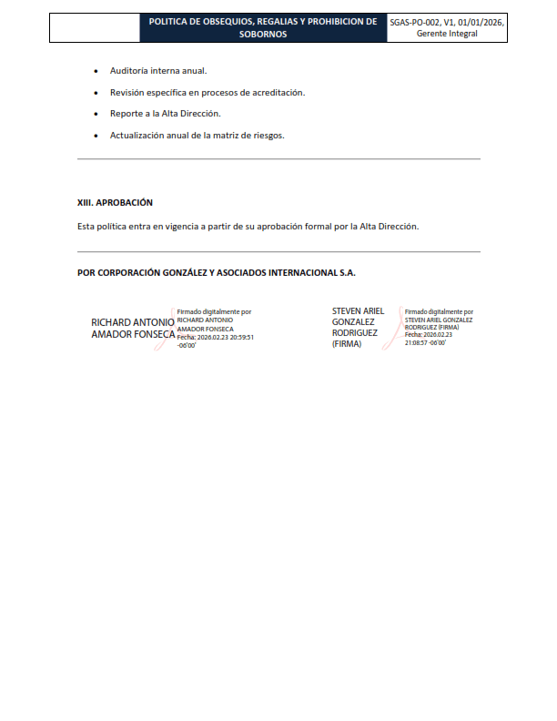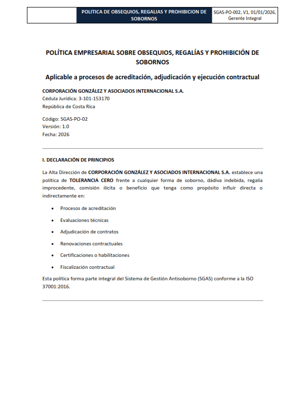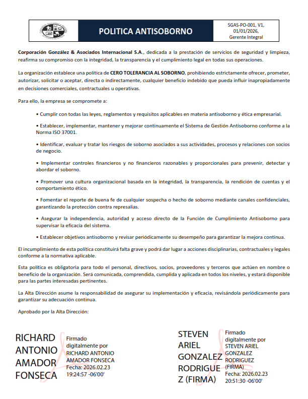 Nuestra empresa esta certificada en ISO 37001, por lo cual estamos comprometidos contra la corrupcion y los sobornos. Denuncie cualquier situacion por este medio o al correo denunciassobresobornos@corporaciongonzalez.com