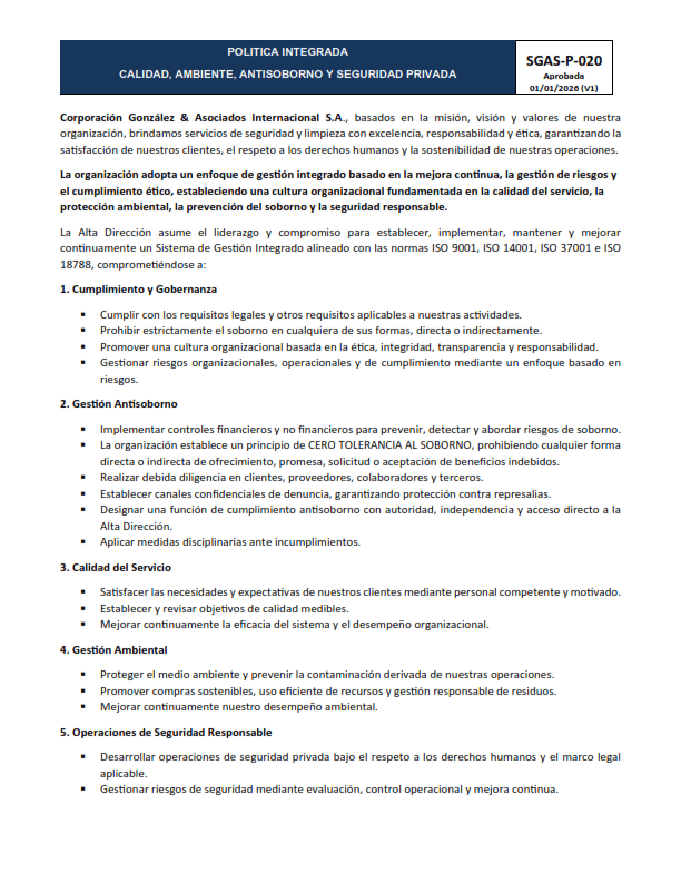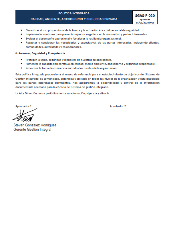 Somos una empresa certificada en Calidad, Ambiente, Antisoborno y Operaciones de Seguridad